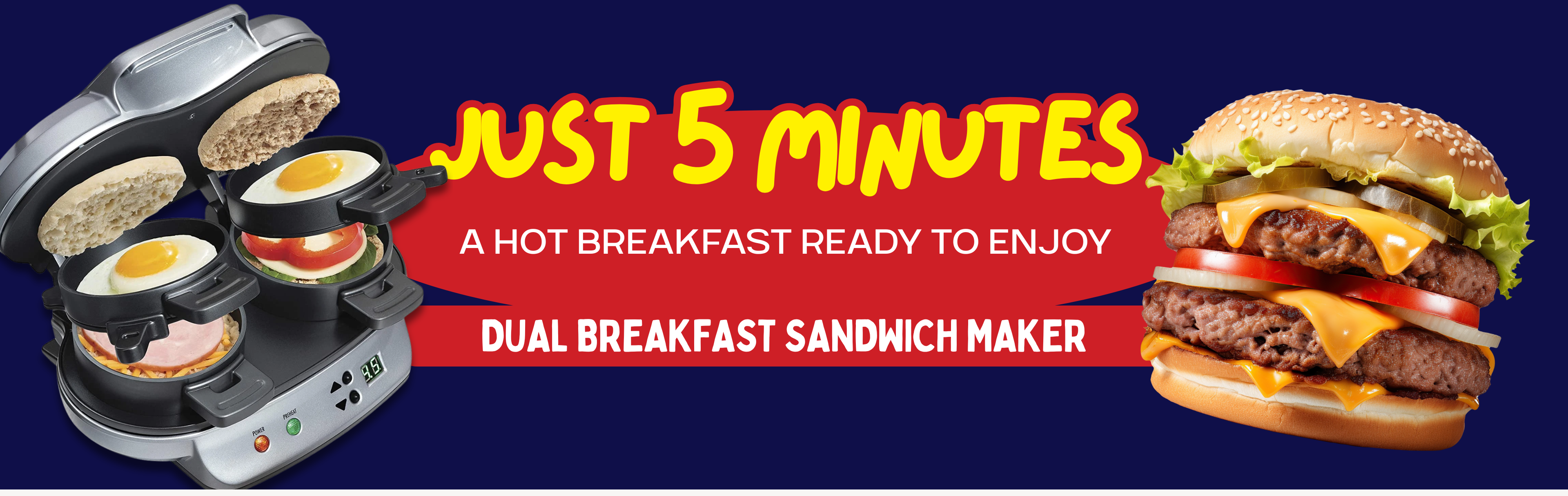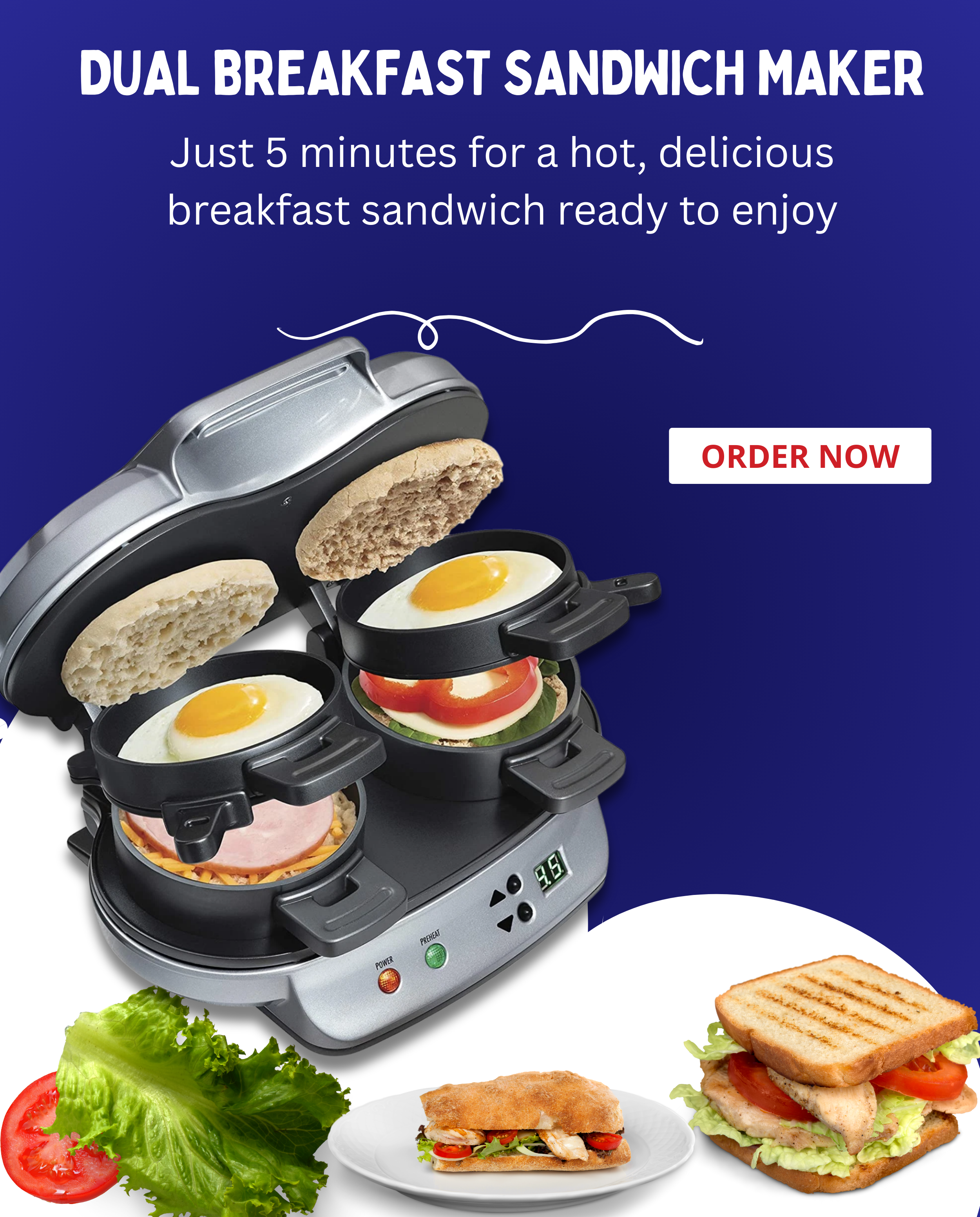 Elevate your mornings with the INNOVYBE™ Dual Breakfast Sandwich Maker. In just 5 minutes, you can create hot, fresh, and delicious sandwiches right at home. Designed for busy parents, students, and professionals, it transforms your kitchen into a café-style breakfast corner.
